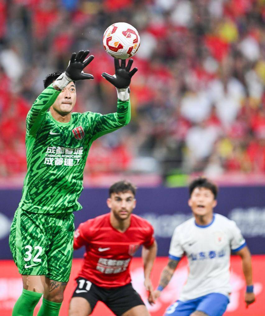 ↑2025年8月2日,成都蓉城队守门员刘殿座(左)在中超第19轮比赛中扑救。新华社发(尹钢摄)