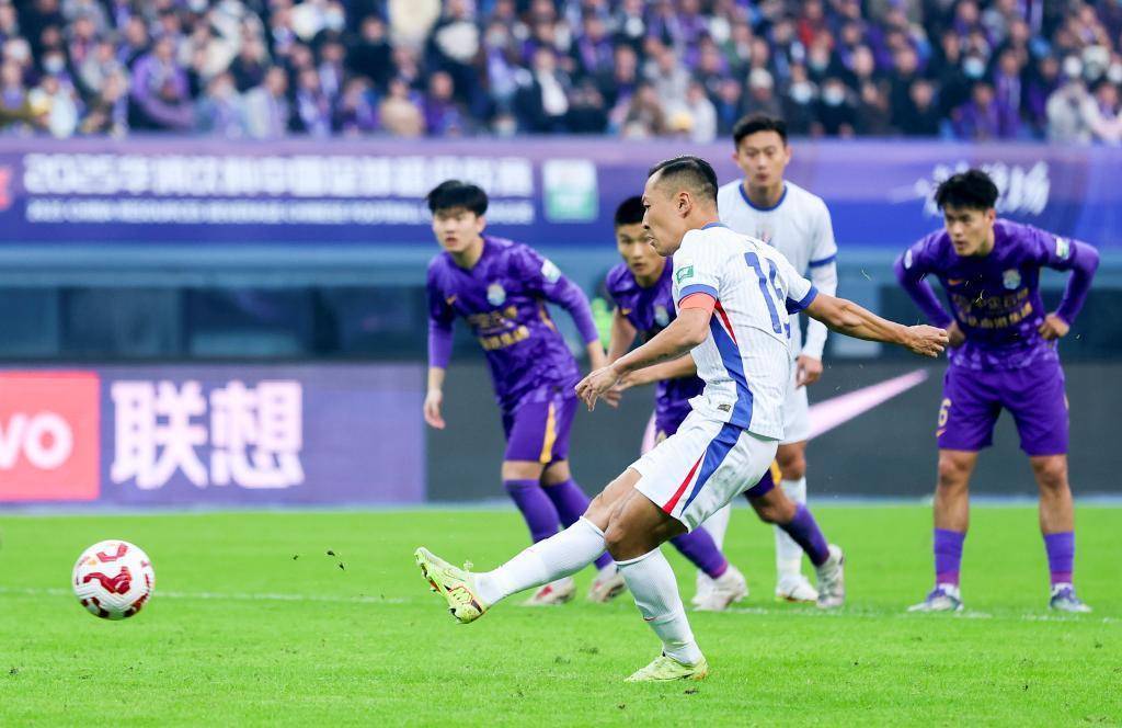 ↑2025年11月22日,上海申花队球员吴曦(前)在中超第30轮点球破门。新华社记者孙凡越摄