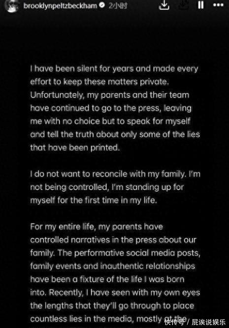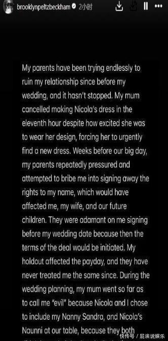 据悉,前段时间布鲁克林发长文公开控诉亲生父母,指责父母操控他的生活,并明确表示“不想与家人和解”。布鲁克林还爆料,父母早于他结婚前便试图破坏其感情,婚礼上母亲还抢了第一支舞等,尽管与父母决裂,也不影响父母对他的爱。估计贝克汉姆父母并不看好大儿子的婚姻,毕竟大儿媳没有与布鲁克林恋爱结婚前,长子一直很听话,结婚后与亲生父母感情变淡,关键是婆媳矛盾一直都在。父母已经抛出橄榄枝,就看布鲁克林接不接啦,如果布鲁克林不接受父母的示好,估计与妻子的感情很好,一时半会儿不会与父母和解。