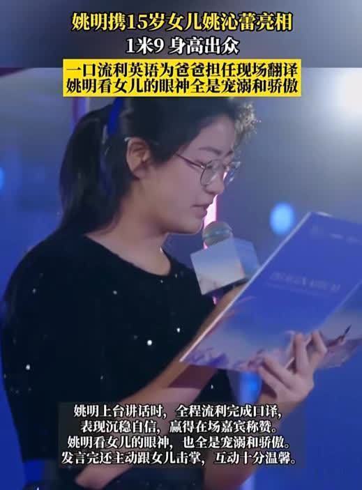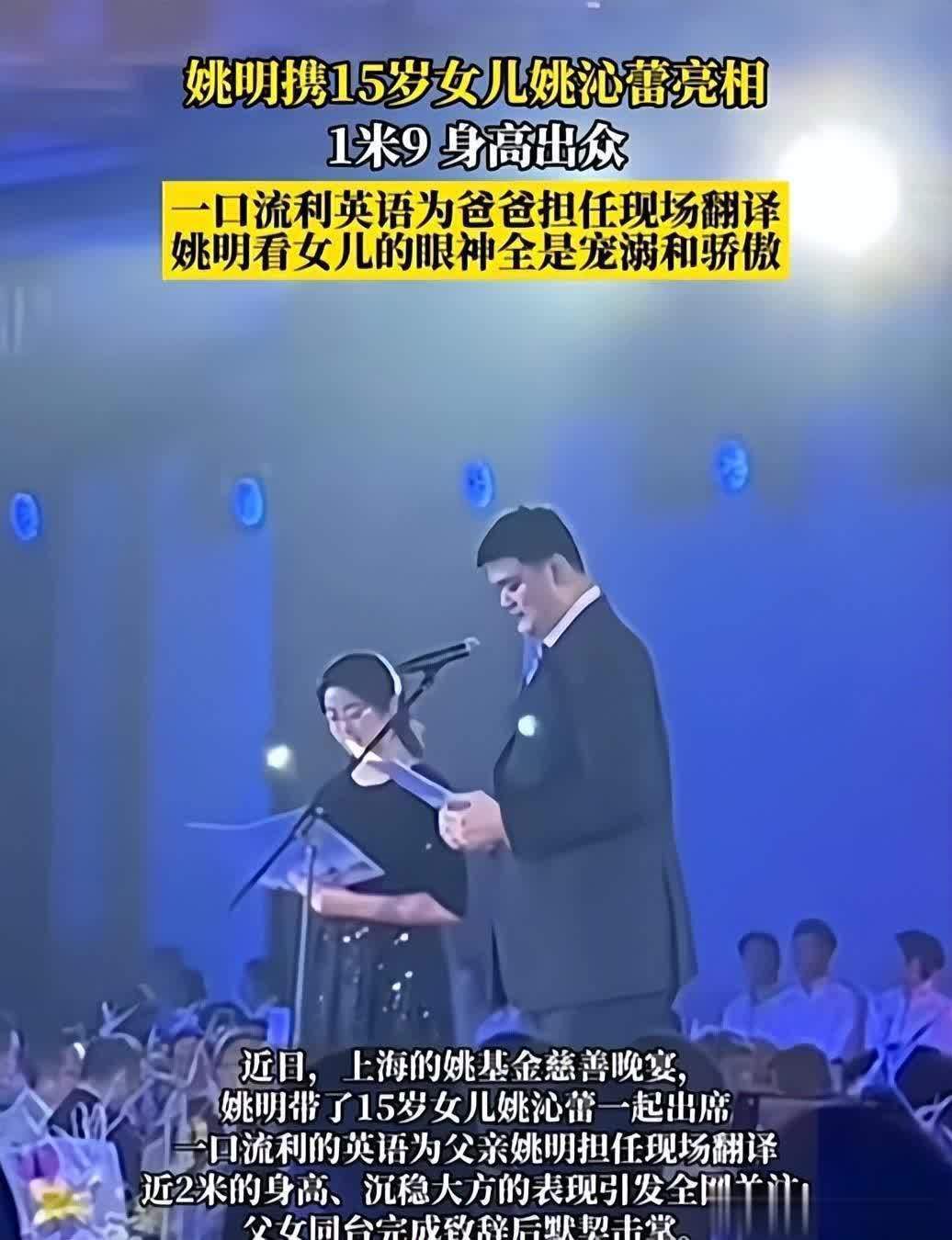 当晚,姚明上台讲话时,姚沁蕾站在父亲身边,全程流利地完成了翻译工作。