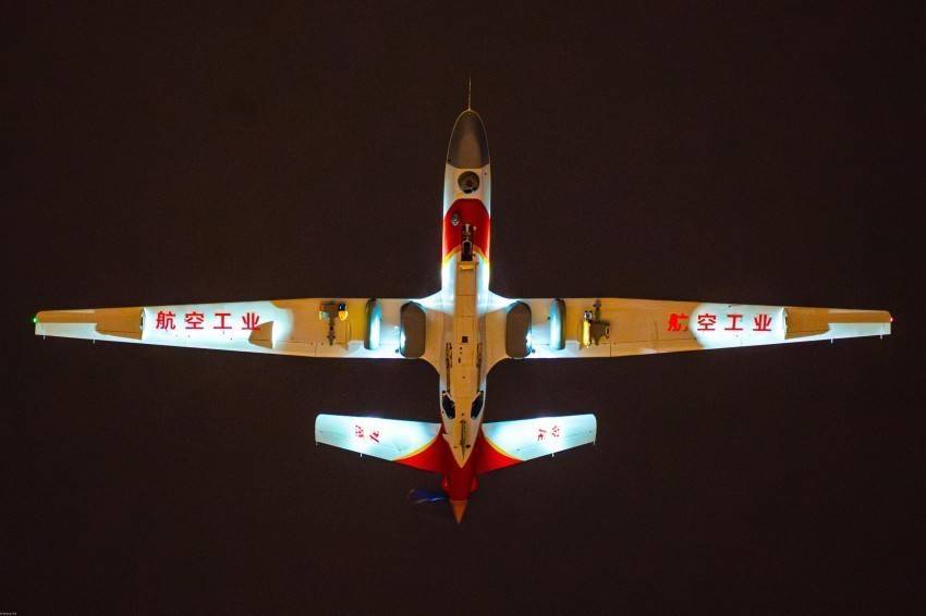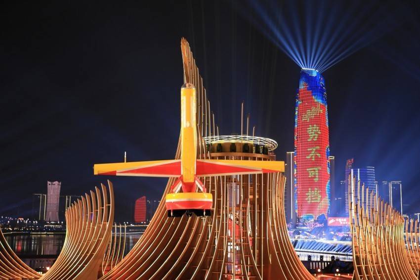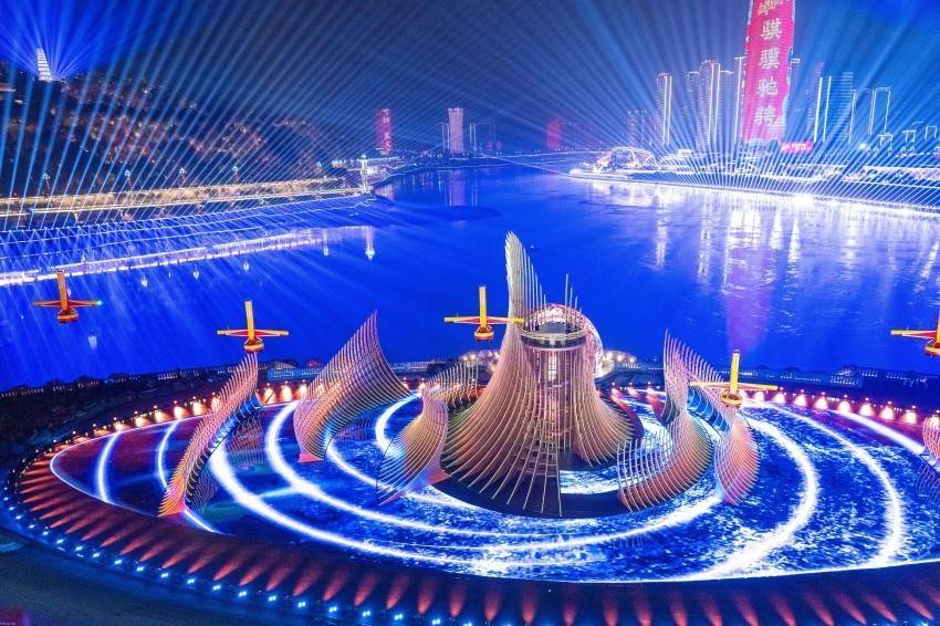 夜幕之下,10架“云影”无人机在成飞“文鳐”智慧管控系统的精准调度下,于舞台区域垂直起飞,随即迅速调整姿态、平稳改平,组成整齐的楔形编队,沿长江江面翱翔盘旋;2架身披“中国红”的“翼龙”无人机从自贡出发,飞过宜宾分会场上空。两型无人机与璀璨舞台、万里江景交相辉映,带来极具冲击力的视觉体验。