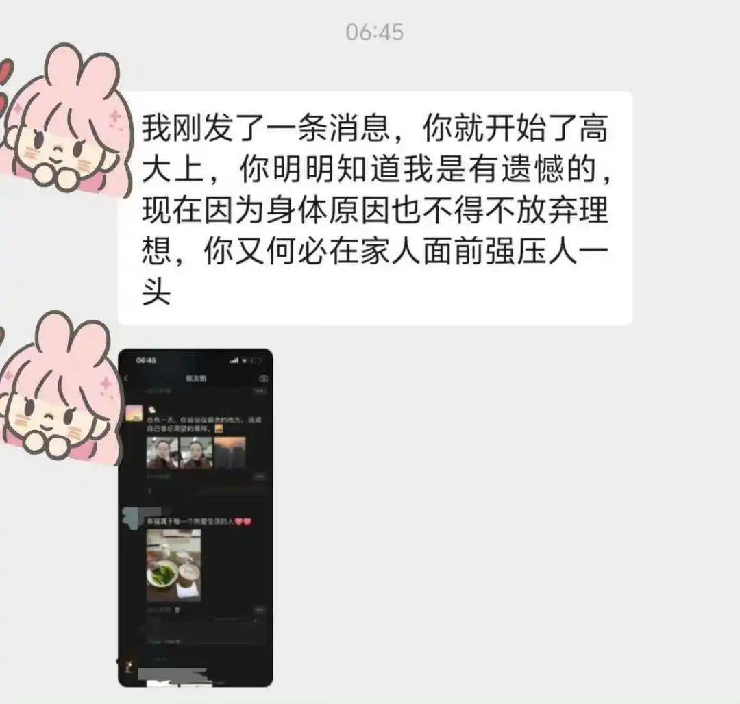 “我刚发了一条消息,你就开始了高大上,你明明知道我是有遗憾的,现在因为身体原因也不得不放弃理想,你又何必在家人面前强压一人头。”